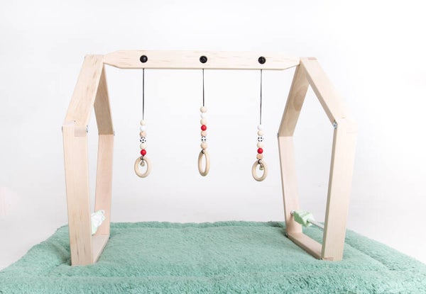 De hangspeeltjes met het kleine voetballetje zorgt voor veel kijk- en speelplezier voor je kleintje! Welke kleur Blox (draaiende blokjes) kies je erbij om de Babygym compleet te maken? Vermeldt de gewenste kleur van de bolletjes aan de hangspeeltjes ook in het veld opmerkingen. In de foto's zijn deze nu rood, maar kunnen ook in blauw, groen, geel, etc. geleverd worden.